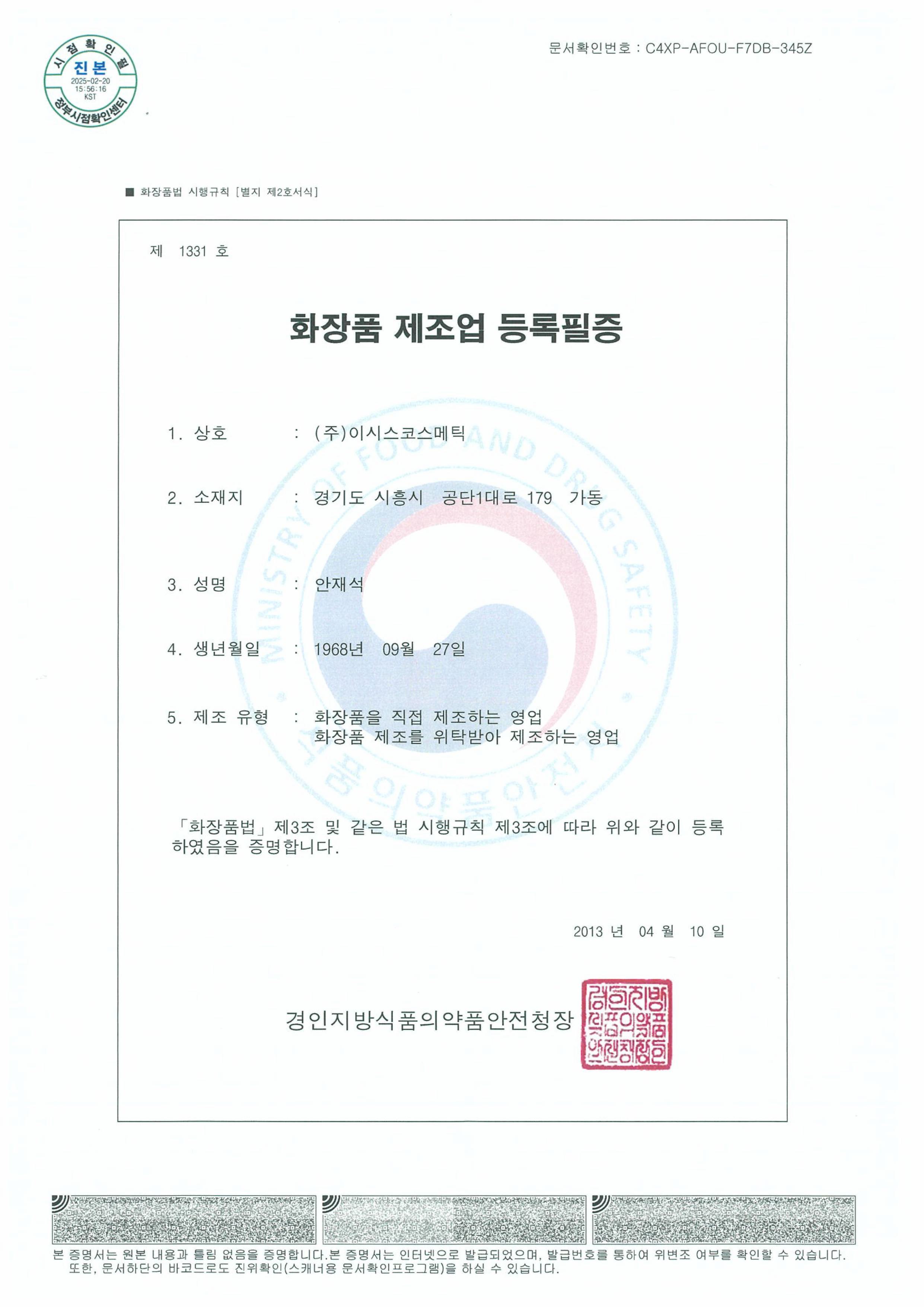이시스코스메틱은 국제기준에 맞게 원료 관리부터 공장 위생관리, 품질관리, 제조공정, 설비관리, 생산과 포장, 출고, 선적에 이르기까지의 일련의 과정들을 컨트롤 하고 있습니다.